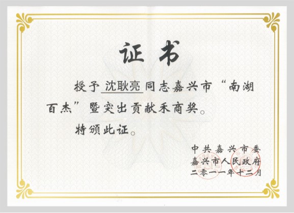 日前,第二届嘉兴市“南湖百杰”优秀人才表彰大会隆重召开,我公司董事长沈耿亮喜获“‘南湖百杰’暨突出贡献禾商奖”。