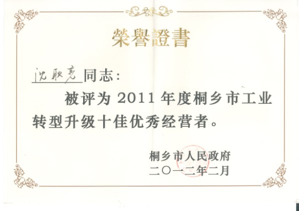 会上公布了2011年度表彰名单,我公司被评为“2011年度桐乡市工业转型升级十大突出贡献企业”、“国家级安全生产标准化企业”。公司下属子公司桐乡上升胶带有限公司被评为“2011年度桐乡市出口十强企业”。同时,公司董事长沈耿亮荣获“2011年度桐乡市工业转型升级十大优秀经营者”荣誉称号。