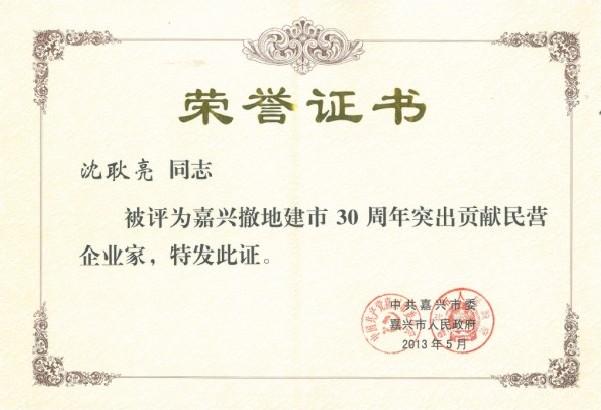 市委副书记高玲慧首先宣读了市委、市政府《关于表彰嘉兴撤地建市30周年民营企业发展先进集团和先进个人的决定》,市四套班子领导为获奖企业和个人颁奖。公司董事长沈耿亮被授予“突出贡献民营企业家”。